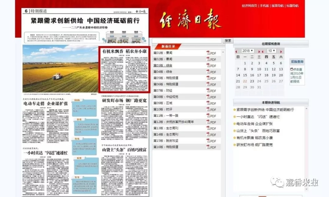10月22日,經(jīng)濟日報特別報道刊發(fā)了《有機稻米飄香 稻農(nóng)奔小康》一文。